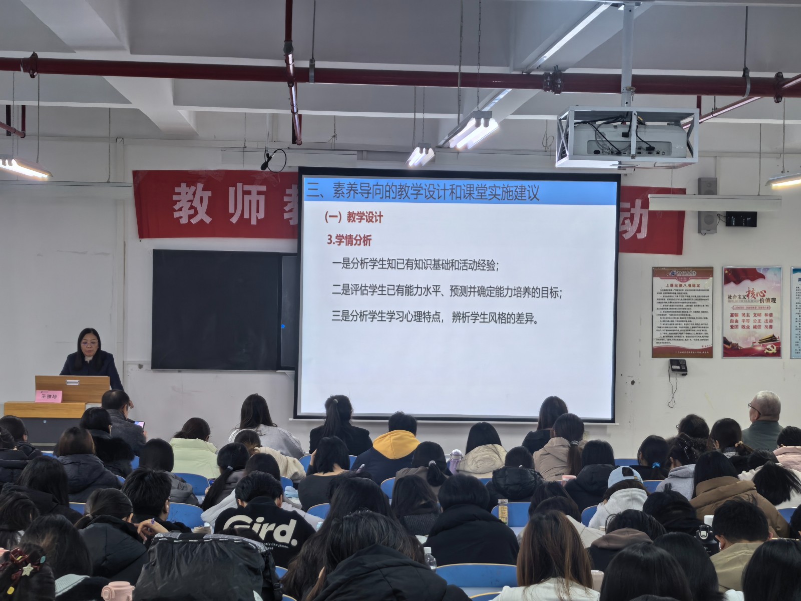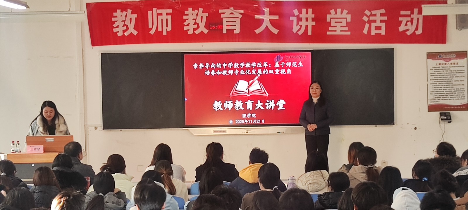 为构建“高校培养符合中学需求、中学实践反哺高校教研”的良性生态,促进数学教育高质量发展,11月21日下午,理学院邀请张家口市教育科学研究所高中数学教研员王雅琴老师以“素养导向的中学数学教学改革:基于师范生培养和教师专业化发展的双重视角”为题做了教师教育专题讲座。本次活动是我校教师教育大讲堂系列讲座之一,数学学科教师、本科生及研究生共150余人聆听讲座,共同探索素养导向下数学教学的新路径与新方法。